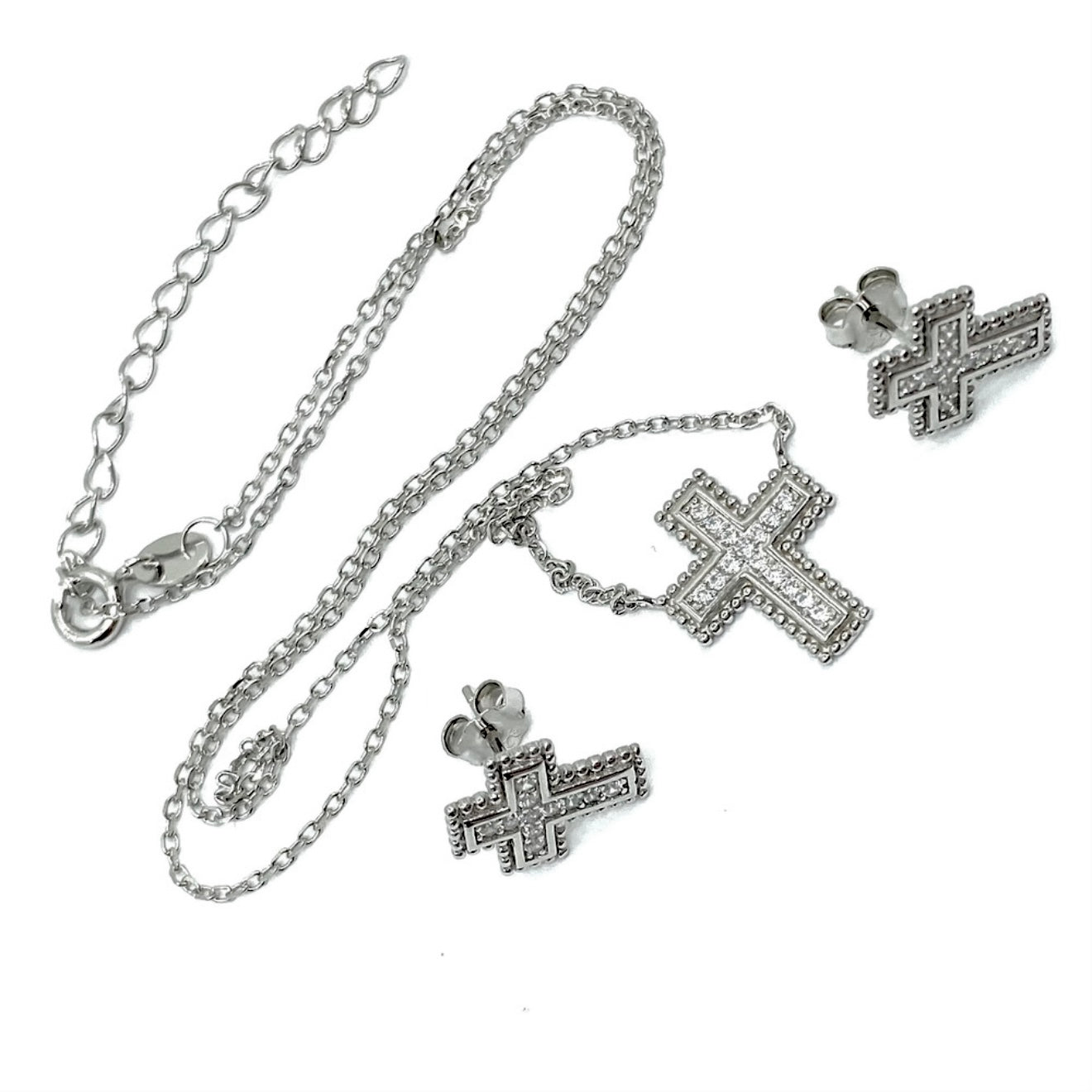 Set din argint rodiat format din colier ajustabil 40-45 cm cu cruce de 13/15 mm și cercei cu șurub dimensiune 10/13 mm.