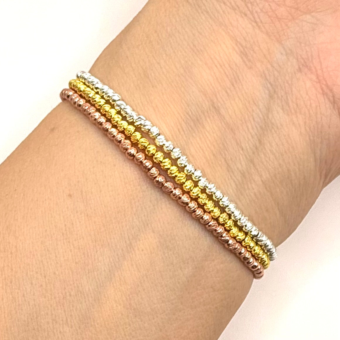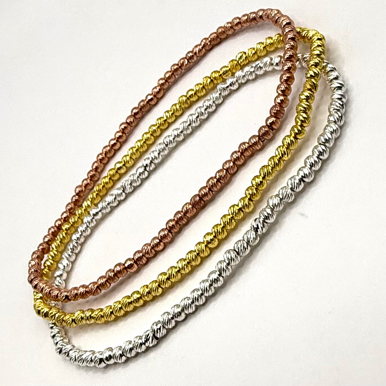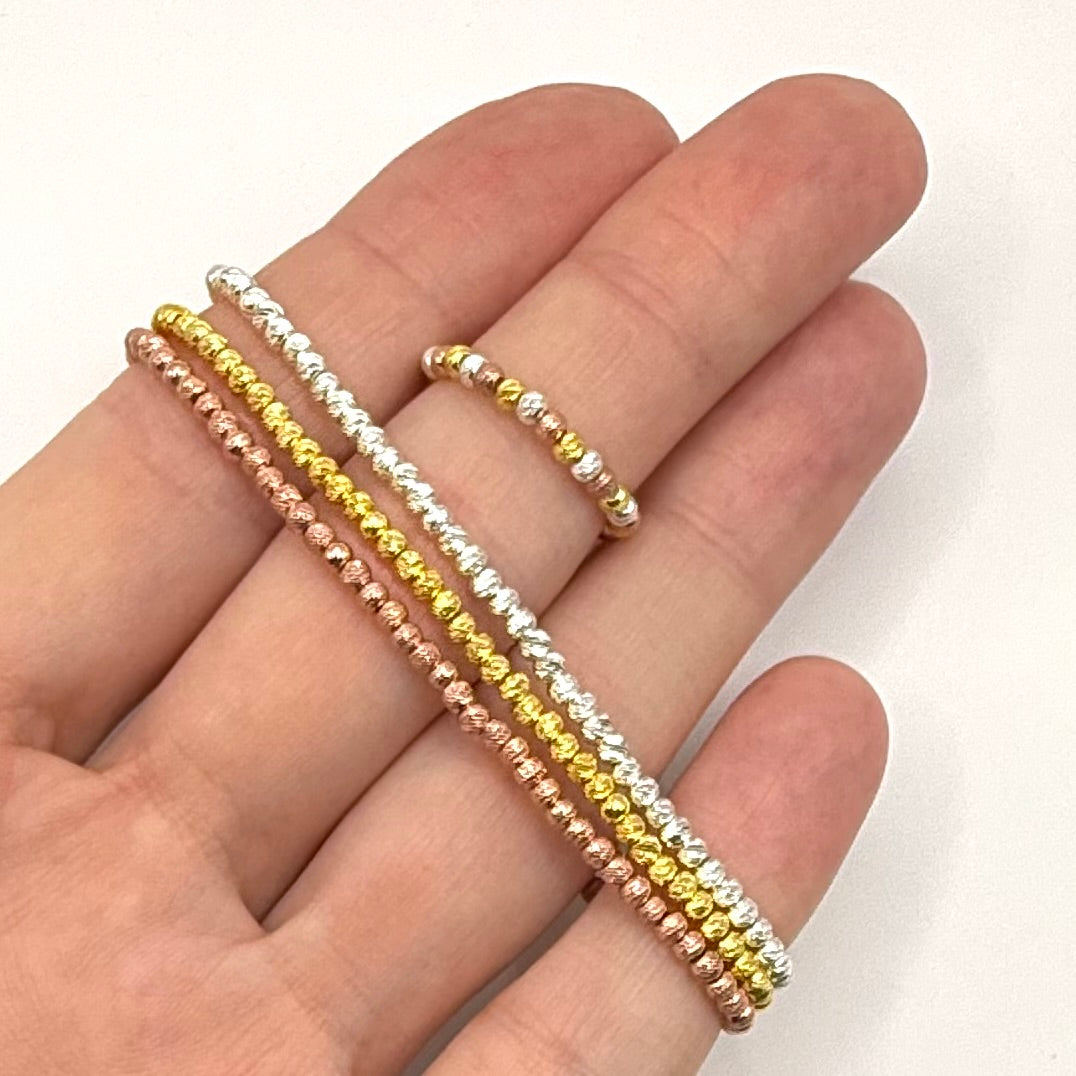 3 bratari pe gută elastica de 16,5 cm din argint cu biluțe fatetate de 2 mm silver, gold, rose.