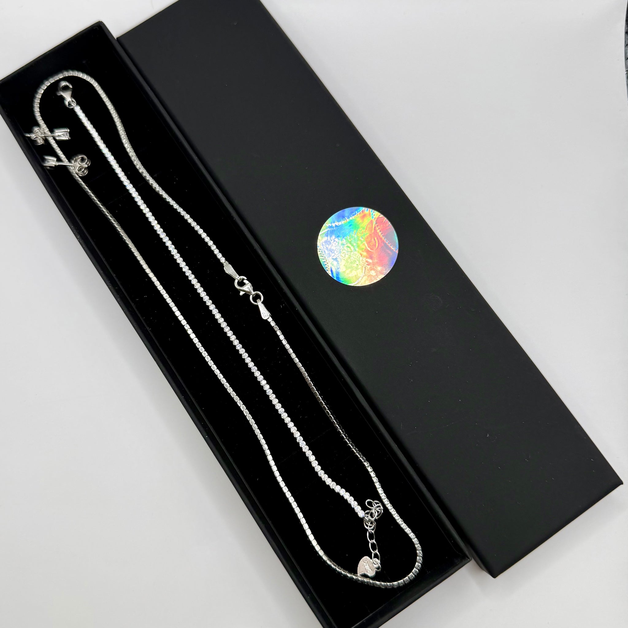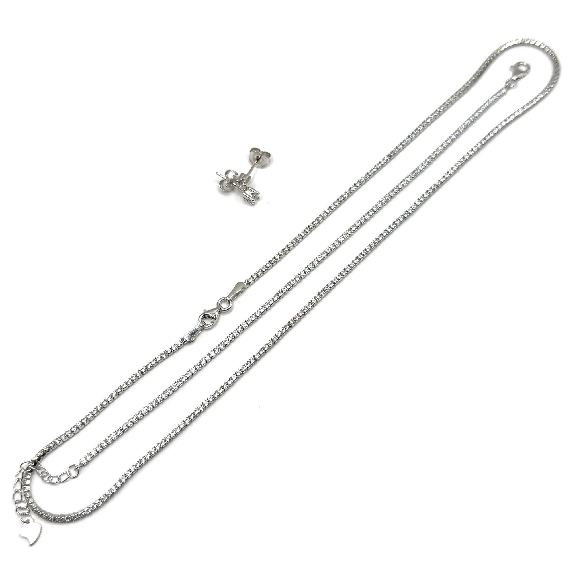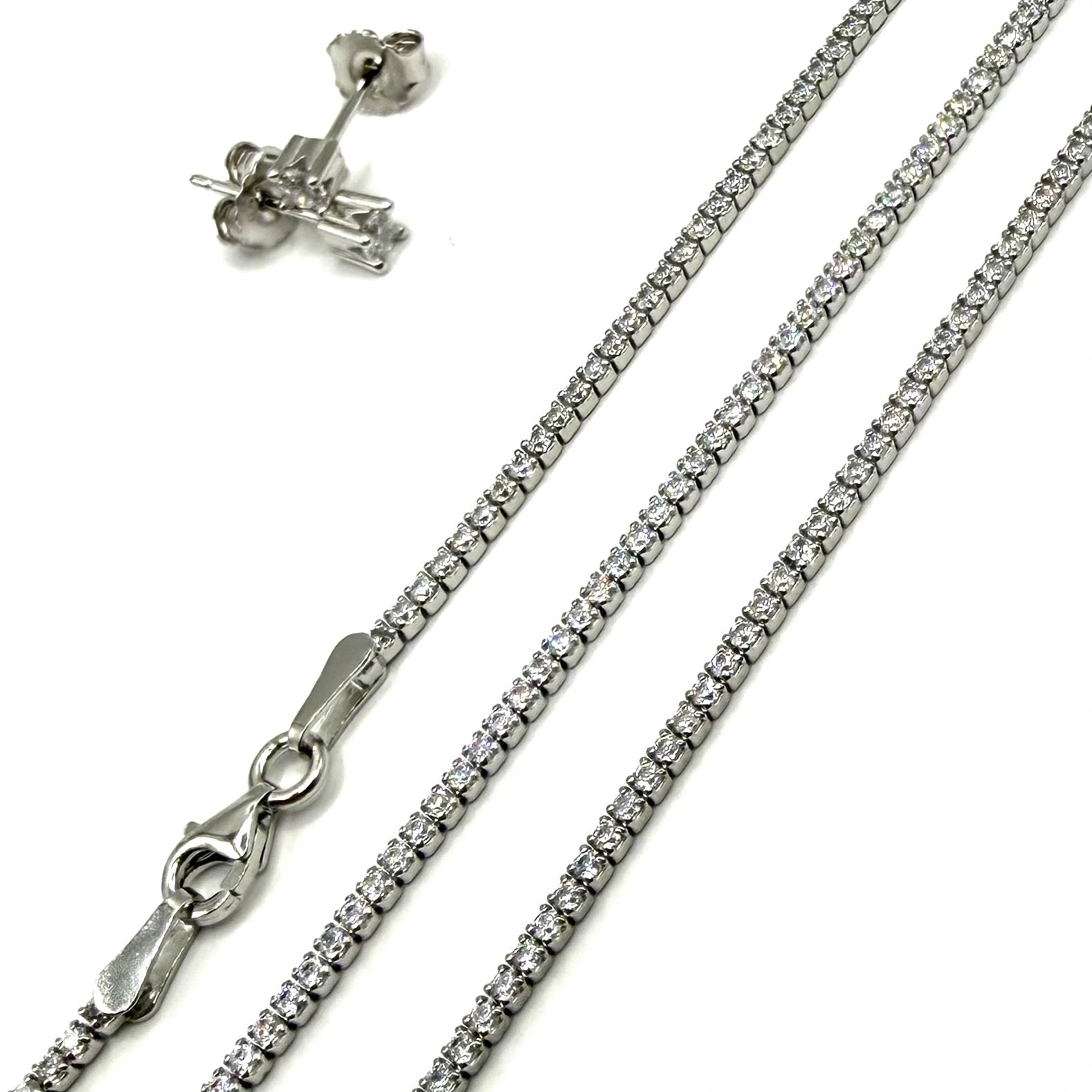 Set din argint 925 rodiat cu zirconiu alb de 1.8 mm latime format din colier de 41 cm lungime, Bratara de 17-21 cm, cercei cadou.